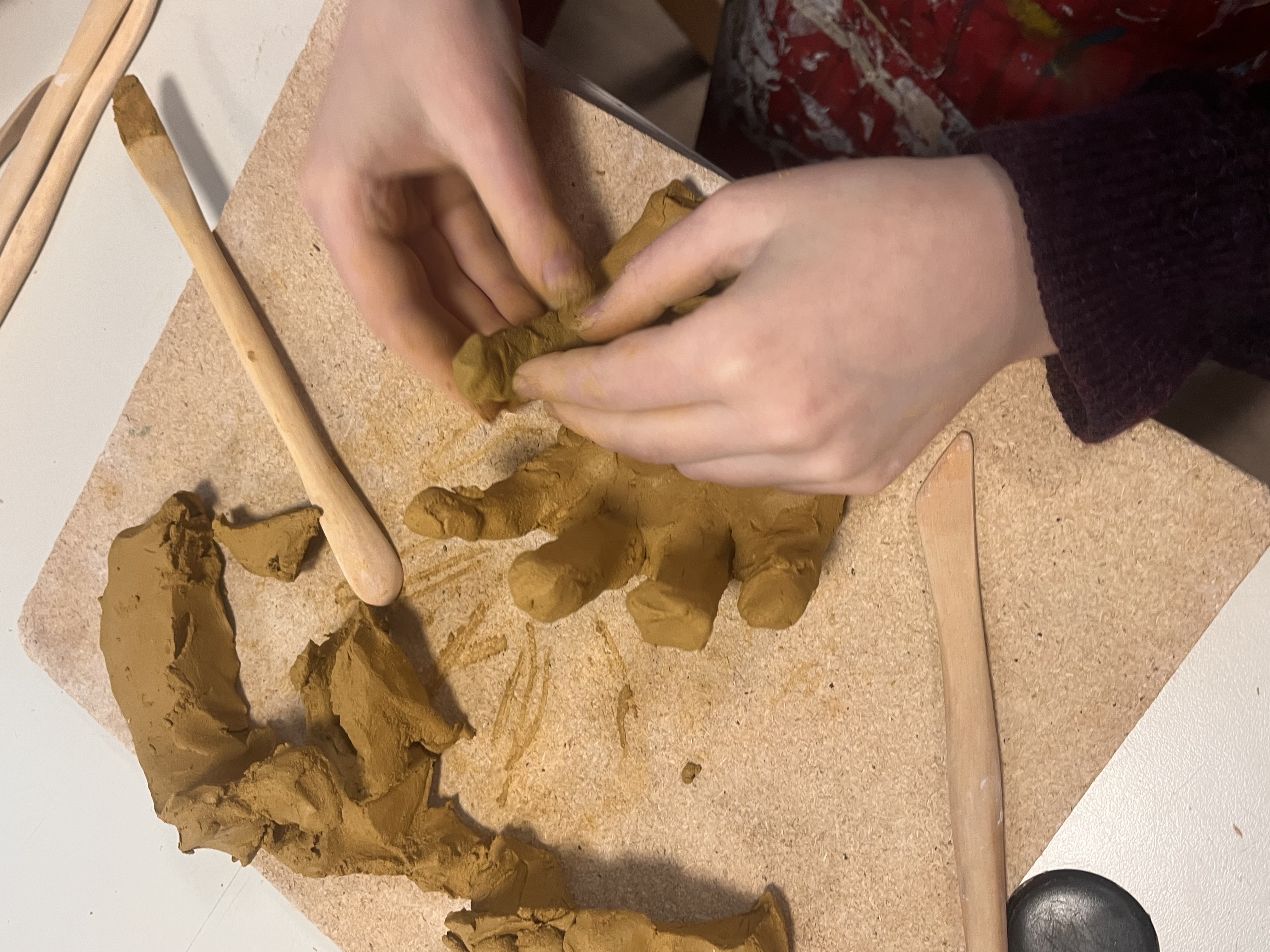 Savityöskentelyn alussa pohdimme yhdessä, mikä olisi paras tapa toteuttaa käsi savesta. Moni oppilas päätyi kaulimaan savesta levyn, piirtämään siihen oman kätensä ääriviivat ja jatkamaan työtä muotoilemalla litteästä kädestä kolmiulotteisen. Lisäksi harjoiteltiin luovaa ongelmanratkaisua, kun yritettiin saada erilaiset kädet pysymään asennoissaan.
